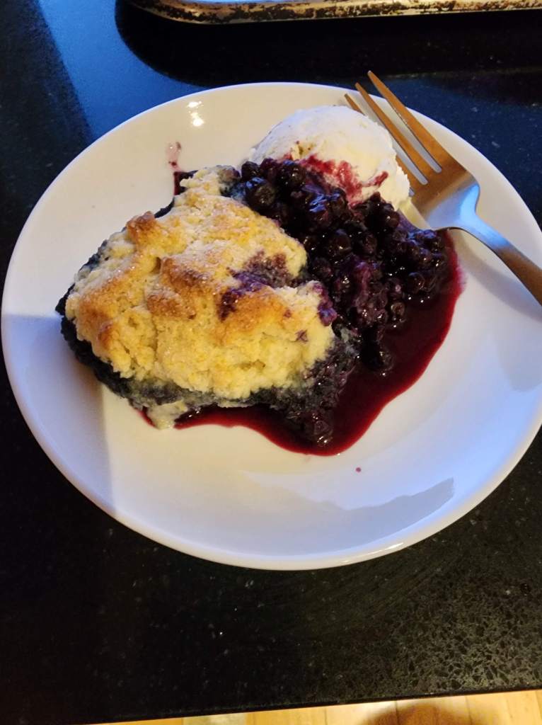 Assemble: Remove the berries from the microwave and discard plastic wrap. Divide the biscuit dough evenly into 8 rough portions. Place on top of the berry mixture, arranging them so they do not touch. Sprinkle with reserved sugar. Place the baking pan on a rimmed baking sheet to guard against bubbling over. Place in the oven and bake for 18-20 minutes, or until the berries are bubbling and the biscuits are golden brown. Cool for about 20 minutes on a wire rack before serving.